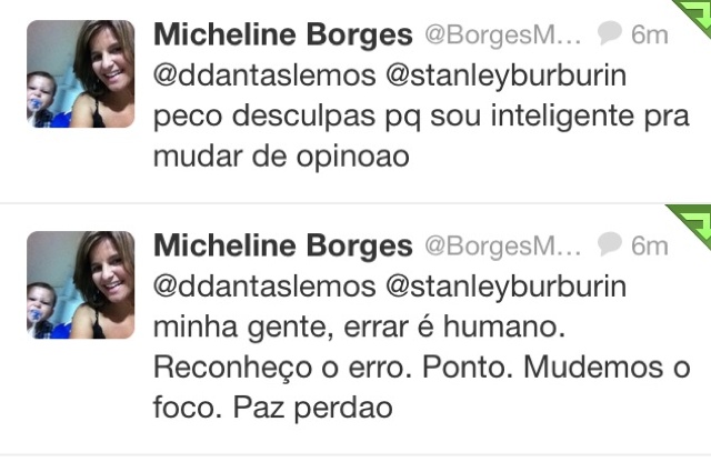 Micheline Borges pediu desculpas no Twitter pelo que falou sobre as médicas cubanas. “Sou inteligente para mudar de opinião”, disse. “Errar é humano, reconheço o erro”, complementou, pedindo paz.