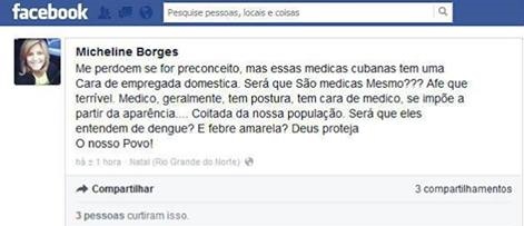 Nas redes sociais os posicionamentos não são menos desastrosos. O mais recente foi o da jornalista potiguar Micheline Borges, que afirmou que as médicas cubanas “têm cara de empregadas domésticas”, questionando se as profissionais da ilha caribenha são realmente formadas em medicina.